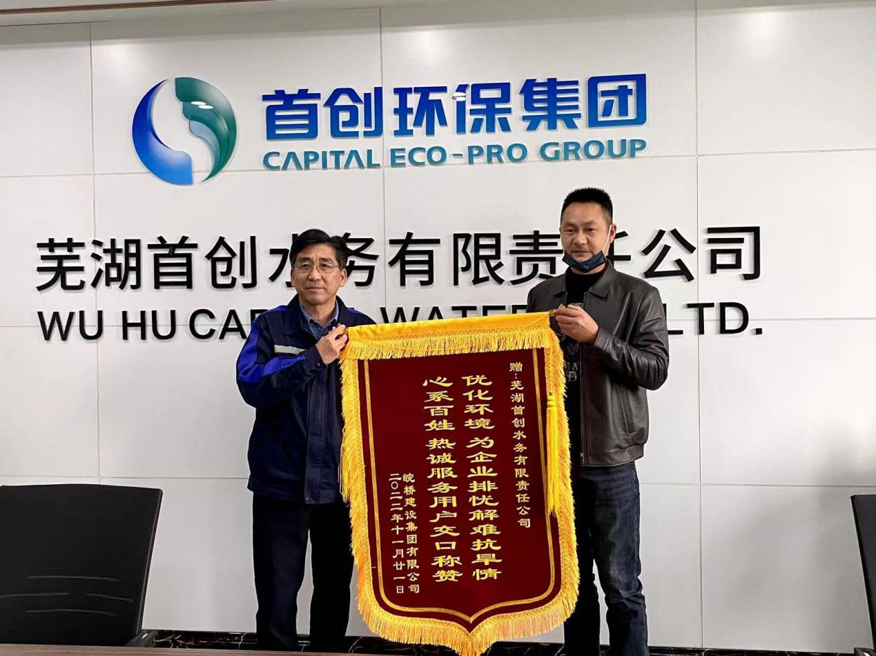 11月24日,皖橋建設(shè)集團(tuán)有限公司負(fù)責(zé)人帶著錦旗專程來到蕪湖首創(chuàng)水務(wù)有限責(zé)任公司,對蕪湖首創(chuàng)在今年夏天抗旱保灌中熱誠周到的服務(wù)表示感謝。